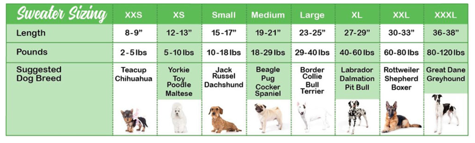 Our sizing can fit a tea cup dog to a great dane. These are the warmest and best quality sweaters you will find out there! Don’t let your dog be left out in the cold!