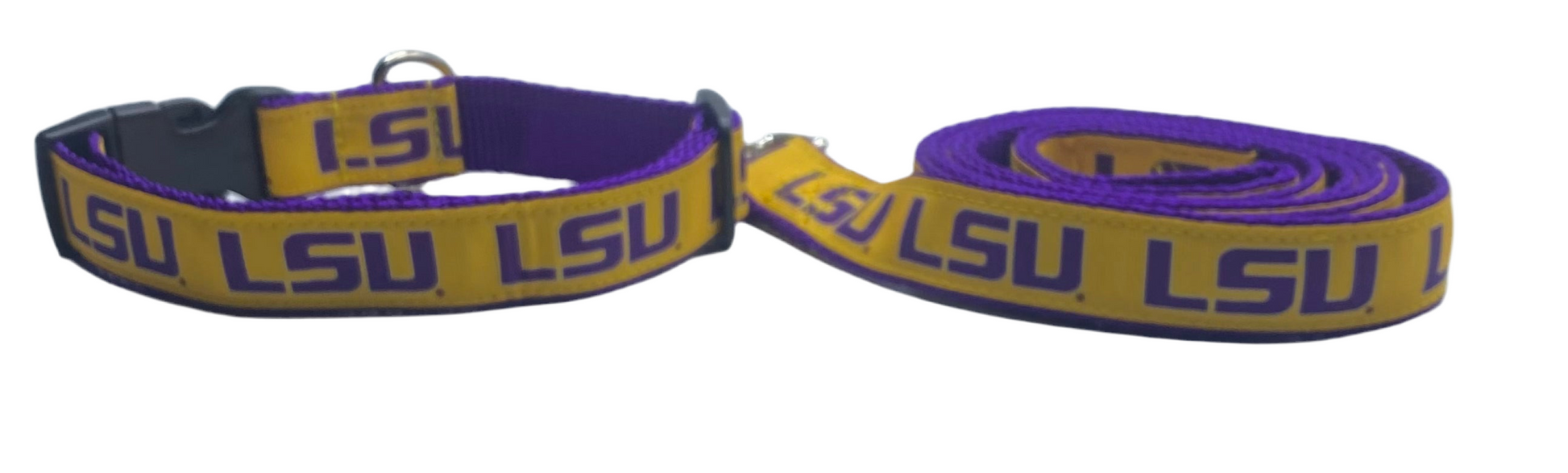LSU dog Collar This collar is made from sturdy yet lightweight nylon and features an adjustable buckle so you can customize the fit. It also comes with a D-ring for attaching a leash.
