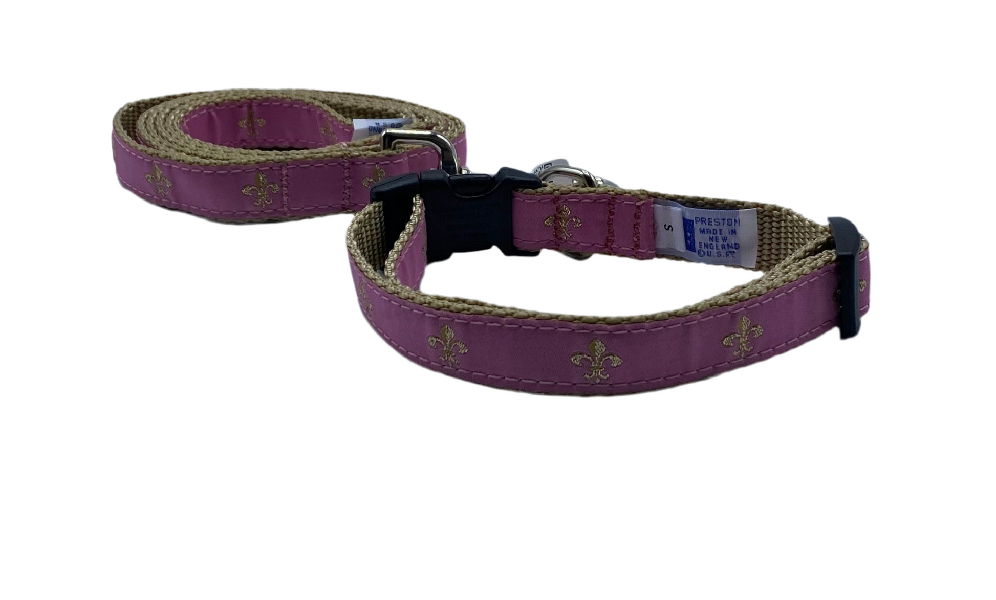 Fleur de Lis Dog Collars, Leashes, & Harnesses. These Fleur de Lis dog collars, leashes, and harnesses are made with durable nylon webbing. Our Fleur De Lis collars, leashes, and harnesses feature Delrin Acetal side release buckles for ease of fastening and separating and solid nickel plated “D” rings for strength. The collars are easily adjusted for length and are available in many sizes. Our leashes use nickel-plated swivel snaps.